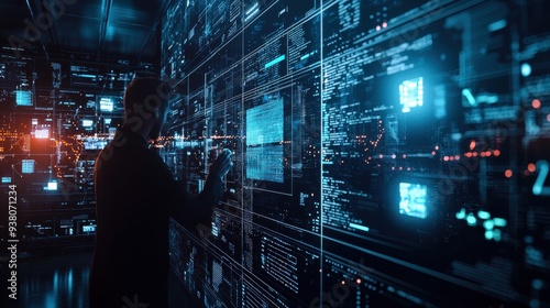 A hacker attempts to breach a secure system while AI-driven cybersecurity software activates, with dynamic data protection visualizations appearing in response.
