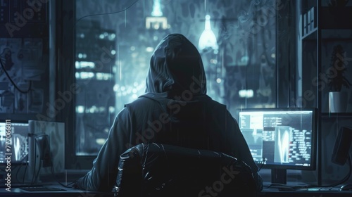 A hacker in a black hoodie sits in front of a computer with code running across the screen showing an image of an internet ransomware attack. Rear view of a hacker