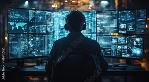 A hacker or programmer sitting at a desk in front of multiple computer monitors displaying data and code.