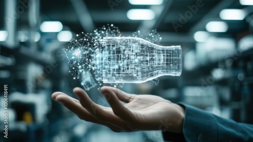 A hand holding a holographic blueprint, with abstract technology and innovation-themed objects floating around it, the planning and execution of innovative ideas