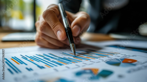 A hand holding a pen reviews graphs and charts on paper, indicating data analysis or business report evaluation.