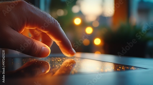 A Hand Interacting with a Digital Surface Displaying Glowing Particles in Soft Focus