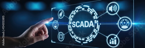 A hand interacting with a graphical user interface displaying a supervisory control and data acquisition system.