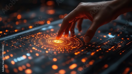 A hand interacts with a digital button, representing AI's deep learning and neural network technology in data processing.