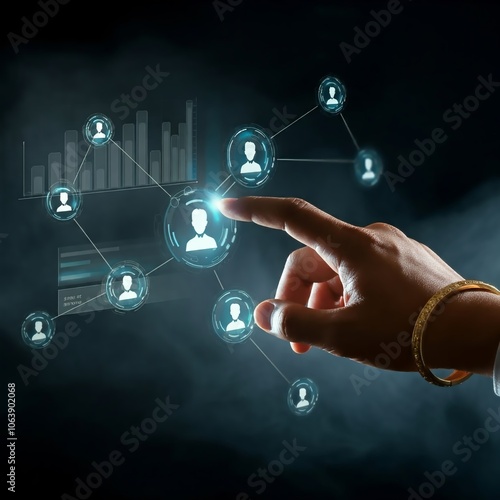 A hand interacts with a digital display showcasing a network of interconnected individuals, possibly representing social connections or data analysis.