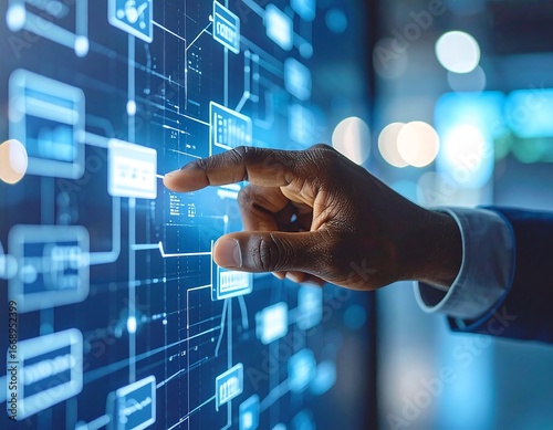 A hand interacts with a digital interface
