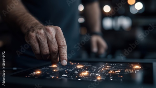 A hand interacts with a digital interface displaying complex patterns and lights, suggesting advanced technology and innovation.