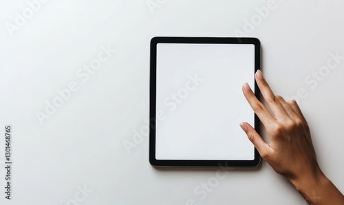 A hand is pointing at a tablet with a white screen