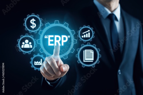 A hand points to an erp system interface.
