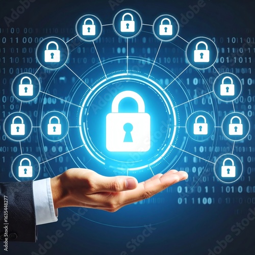 A hand presenting a digital security concept with illuminated padlocks, representing data protection.