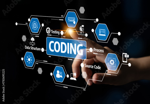 A hand reaches out to engage with a digital coding interface, featuring elements like testing, data structure, and source code, symbolizing technology and innovation. Tessel