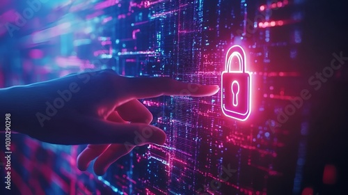 A hand reaches out to touch a glowing digital lock on a colorful, data-filled background, symbolizing cybersecurity and data protection.