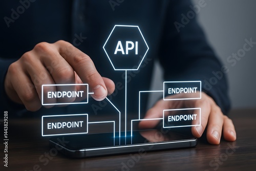 A hand touches a glowing “api” node connected to multiple “endpoint” branches on a tablet screen. Concept of modular system integration and scalable development.