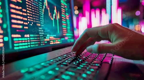 A hand types on a keyboard in front of a computer screen displaying a stock market graph.