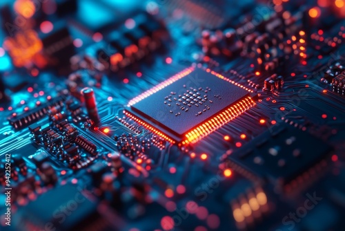 A highly detailed and vivid imagery of a microchip is presented, showcasing the intricate and complex circuitry, which highlights the remarkable advanced technology embedded within modern electronics