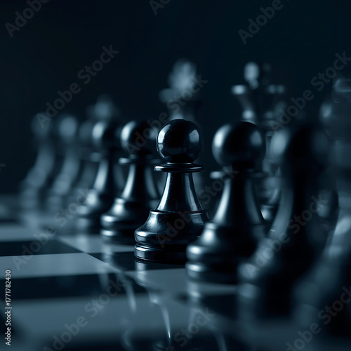 A high-quality close-up photo of black chess pawns, with one pawn in focus and slightly ahead of the others, set against a softly blurred background.
