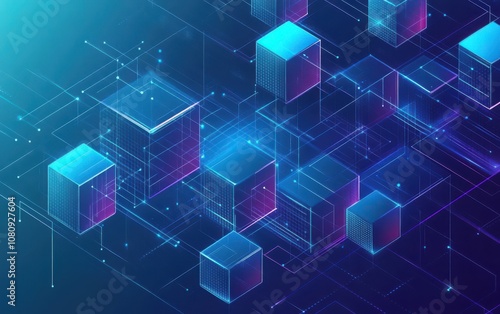 A high-quality vector illustration of a blue background with blue and purple lines arranged into isometric cubes.