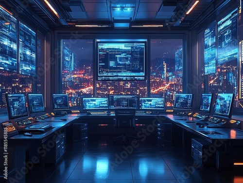 A high-tech control room with multiple screens displaying data and city views, designed for monitoring and analysis.