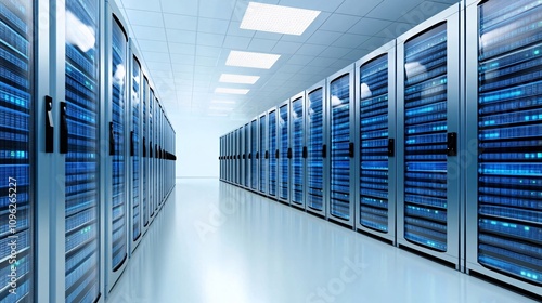 A high-tech data center featuring rows of servers with blue lighting, creating a sleek and modern computing environment.