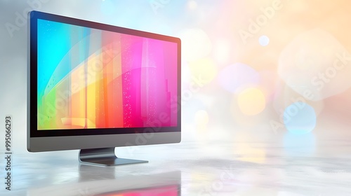 A high-tech icon of a computer monitor with a slim frame and vibrant screen placed on a clean white surface with soft reflections
