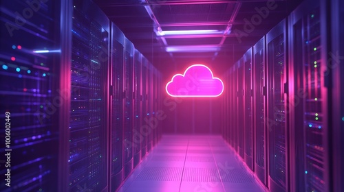 A high-tech server room with a hologram of a cloud icon floating above the servers, representing cloud data hosting.