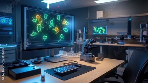A holographic display of engineered immune cells being programmed for cancer treatment.