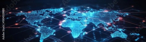 A holographic world map with connected nodes, symbolizing global merger integration, corporate blue color palette, digital art, hightech, style