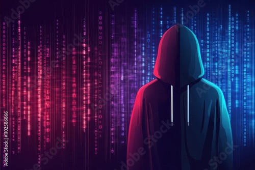 A hooded figure stands before a digital backdrop of flowing binary code, symbolizing technology.