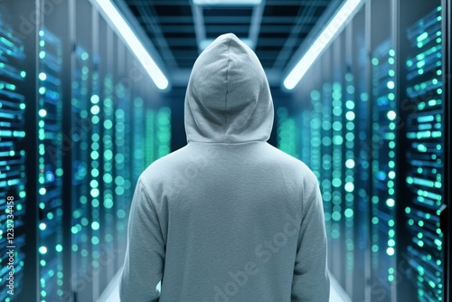 A hooded figure's back view inside a server room, facing rows of glowing computer servers.