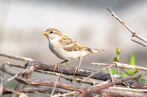 A house sparrow bird sitting on tree branch.