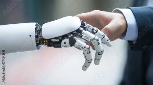 A human hand shakes a robotic hand, symbolizing collaboration between humans and technology.