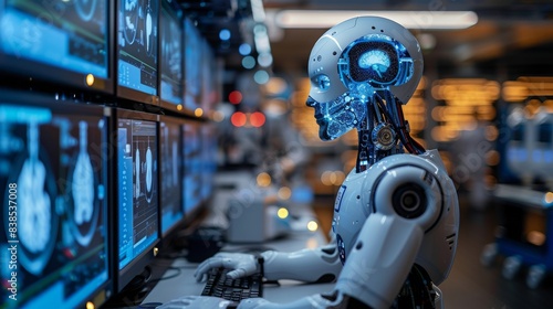 A humanoid robot, equipped with AI algorithms, analyzes medical data displayed on multiple computer screens in a laboratory setting. The robots internal circuitry and brain are visible, highlighting