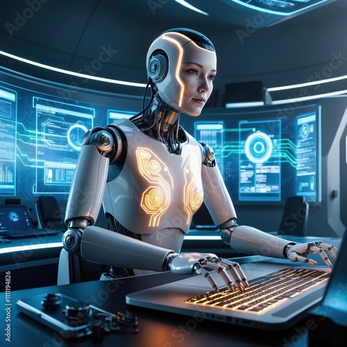 A humanoid robot processing data in a secure environment, blocking hacker attacks, with digital security measures visible in the background