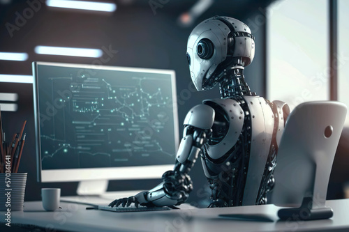 A humanoid robot sits at a table using a computer as artificial intelligence. Artificial intelligence. Android. ai generated.