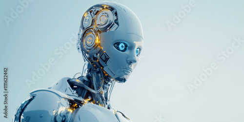 A humanoid robot with advanced technology features, standing in a futuristic, high-tech setting.
