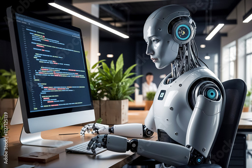 A humanoid robot with artificial intelligence has replaced a programmer in the office and writes code on a computer. The concept of replacing people with robots and AI.