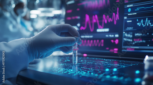 A lab environment where a gloved hand adjusts a vial amidst holographic health data, symbolizing precise diagnostics for targeted treatment.