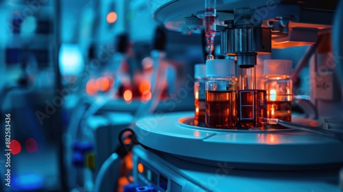 A lab with many bottles and a machine with a light on it