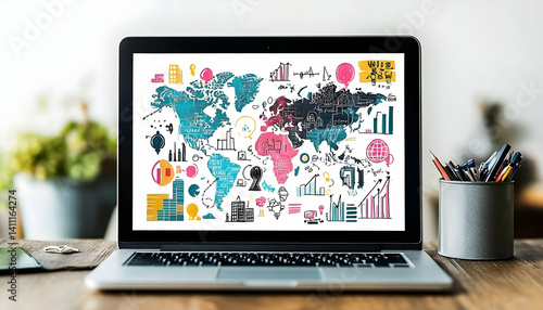 A laptop displaying a colorful world map with charts and graphs, set on a wooden desk with plants