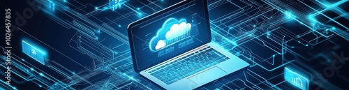 A laptop displaying cloud computing with digital connections and data flow.