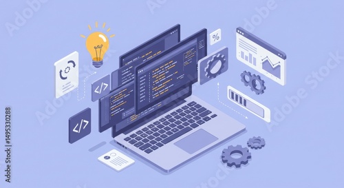A laptop displays coding and data analytics, surrounded by icons representing technology.