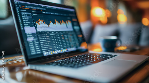 A laptop is open to a screen displaying financial data. A cup of coffee is sitting on the table next to the laptop