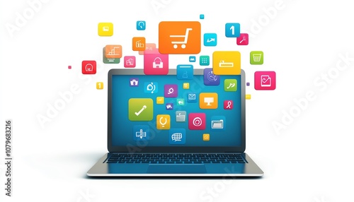A laptop with colorful digital icons and apps hovering above, representing the digital world of online connectivity, communication, and modern technology in vibrant colors