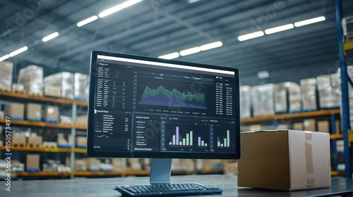 modern, warehouse, interior, display, monitor, screen, chart, datum, visualisation, bar, graph, line, type, white, computer, host, background, shelf, rack, box, stacked, tidy, organised, efficient, management, structure, systematic, order, design, space, utilization, storage, good, inventory, supply, chain, operation, workflow, logistic, business, process, visibility, control