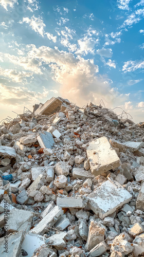 A large rubble pile after building implosion under blue sky