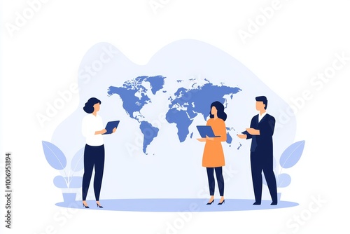 A leader standing in front of a world map, planning a global strategy with team members surrounding them