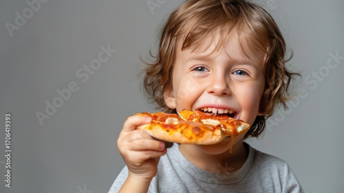 A little boy eats pizza on a gray background