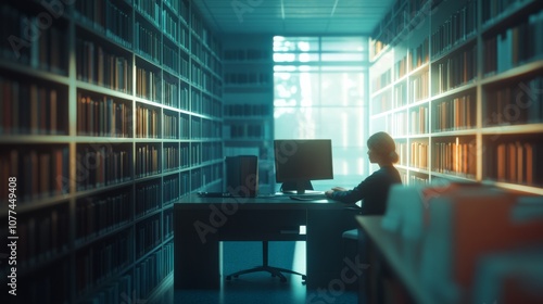 A lone figure works at a computer in a dimly lit library with glowing bookshelves, absorbed in the ambiance of knowledge and focus.