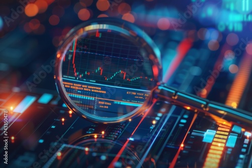 A magnifying glass focusing on graphs and data on a high-tech digital interface.