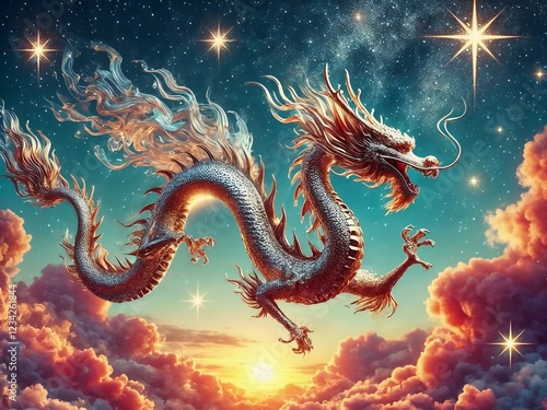 A majestic golden dragon soars gracefully through a breathtaking sunset sky, stars glittering around it.